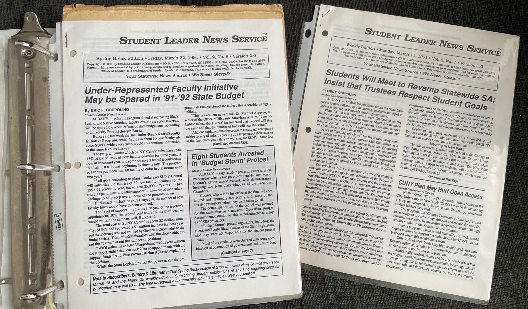 I mentioned that I covered higher education. Mostly this came in the form of Student Leader News Service. In 1989, organized a network of student newspapers across New York’s public colleges and universities. We distributed news to student publications, provided the newsletter above to student government leaders, unions and organizations.