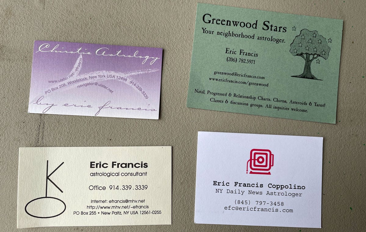 Here are a few of my business cards from various points in my career. The green one to the top right was during my brief stay in Greenwood Lake in Seattle, where thankfully I only lived for a month. From there, my next stop was London, where Jonathan Cainer sent a car to fetch me at Gatwick Airport, in an effort to get me into his job at the Daily Mirror, which he was vacating. I ended up staying in England and then Europe for more than three years.