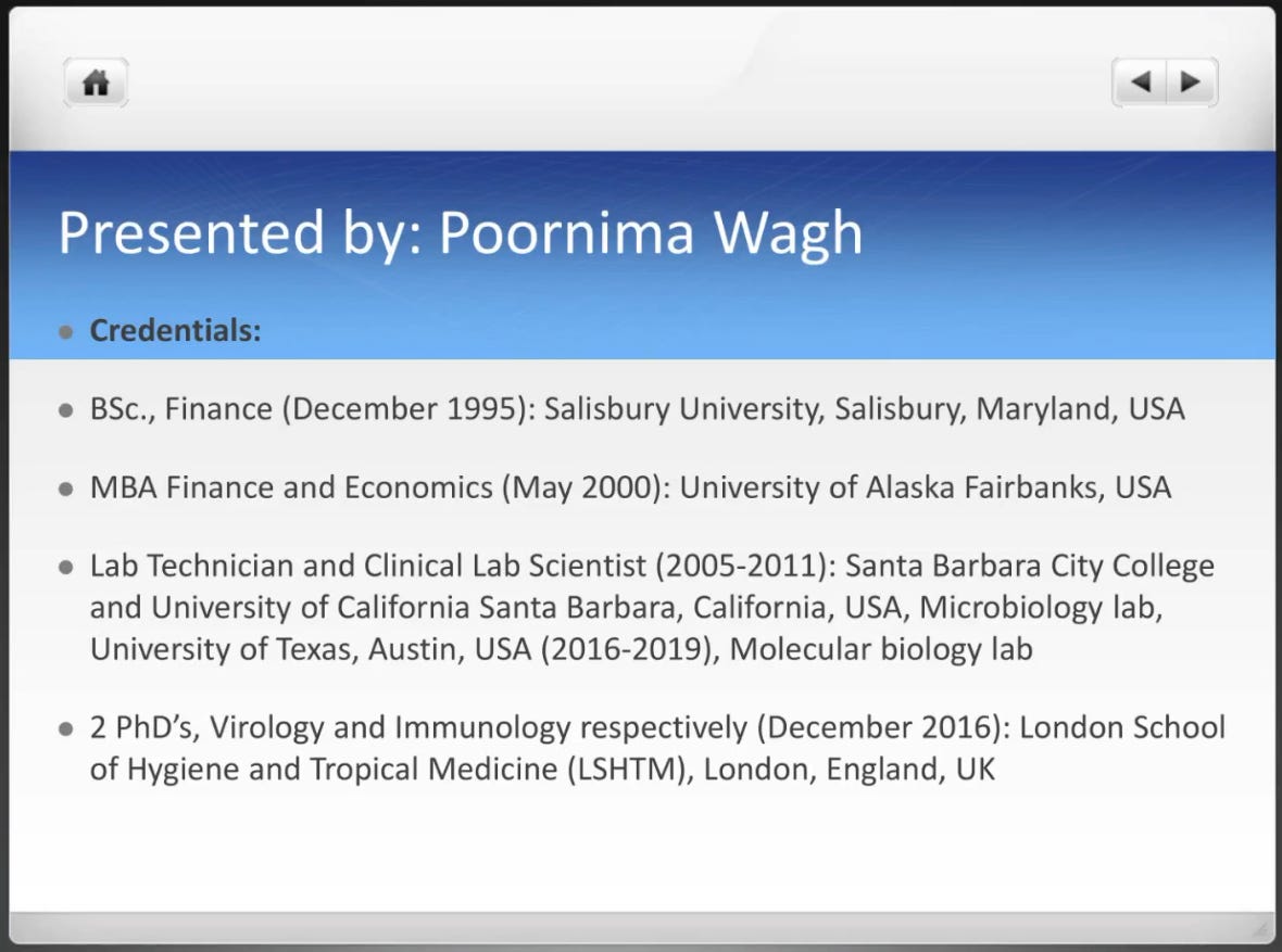 Wagh's admitted background is in finance, though she also claims to have worked as a clinical lab scientist from 2005-2019 at two different universities, one in Texas and one in California. That is possible, as she knows some laboratory jargon.