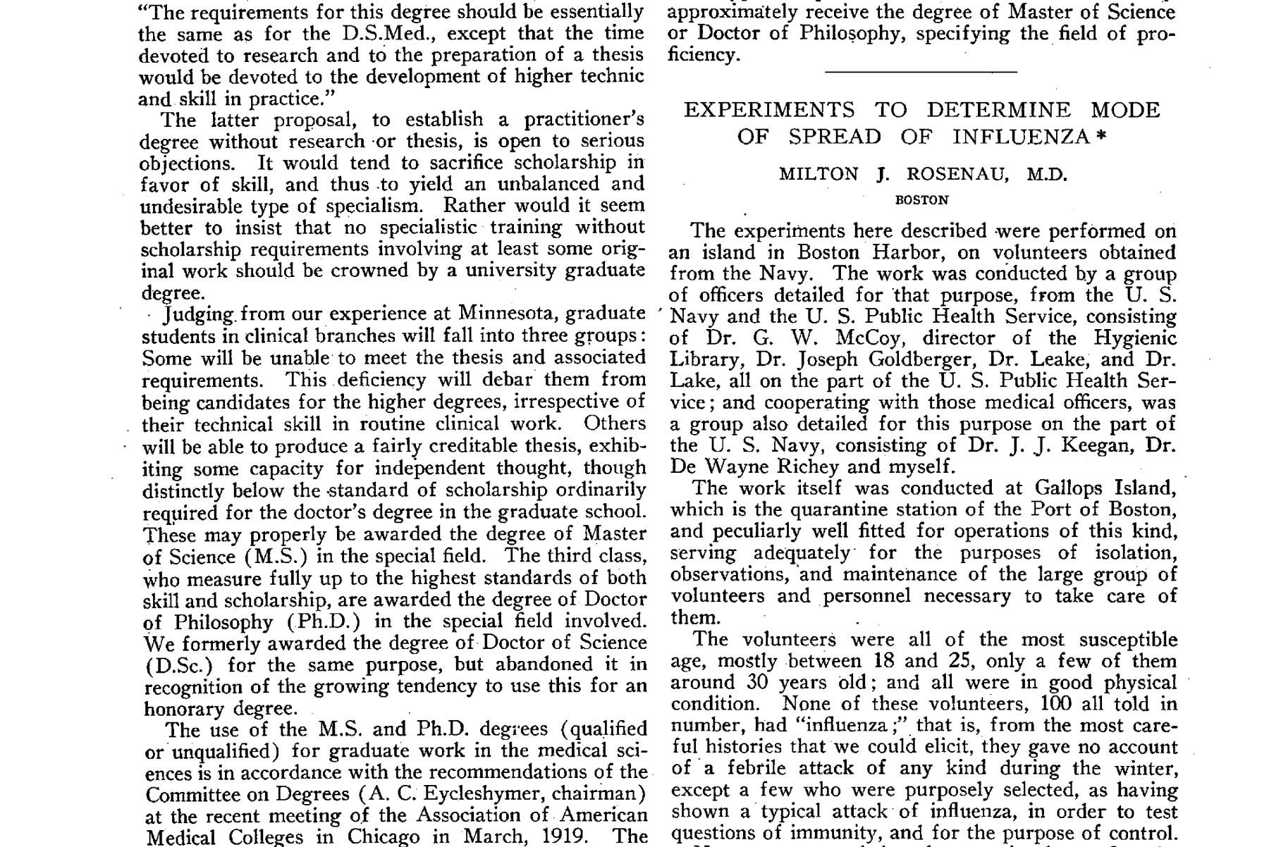 Accounting for these experiments in Journal of the American Medical Association (JAMA), Vol. 73, No. 5, Aug. 2, 1919, Dr. Roseneau wrote, "We entered the [Spanish Flu] outbreak with a notion that we knew the cause of the disease, and were quite sure we knew how it was transmitted from person to person. Perhaps, if we have learned anything, it is that we are not quite sure what we know about the disease."