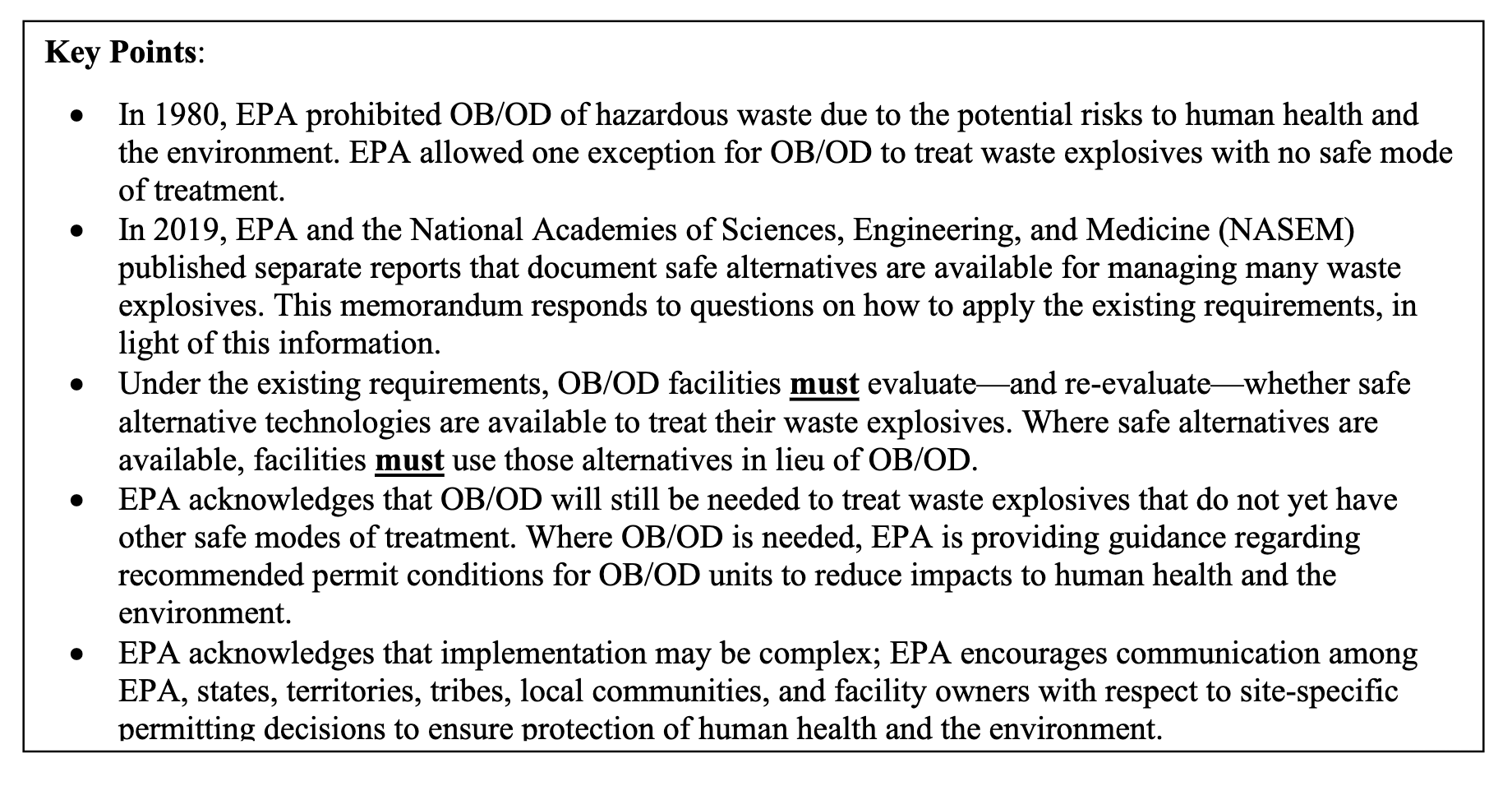 A June 7, 2022 guidance memo from EPA interpreting federal regulations and bans the open detonation/open burning of toxins.