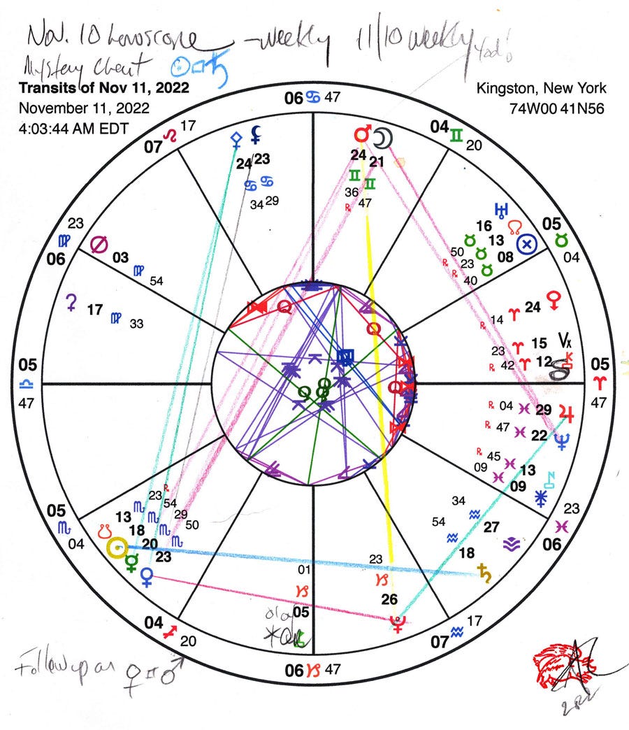 I’ve been writing a lot of astrology these days, including the Inner Space annual and getting ahead on horoscopes. I spoke to my first client today in months. I have some added thoughts on the chart I used to write the weekly horoscope, which I will share here.