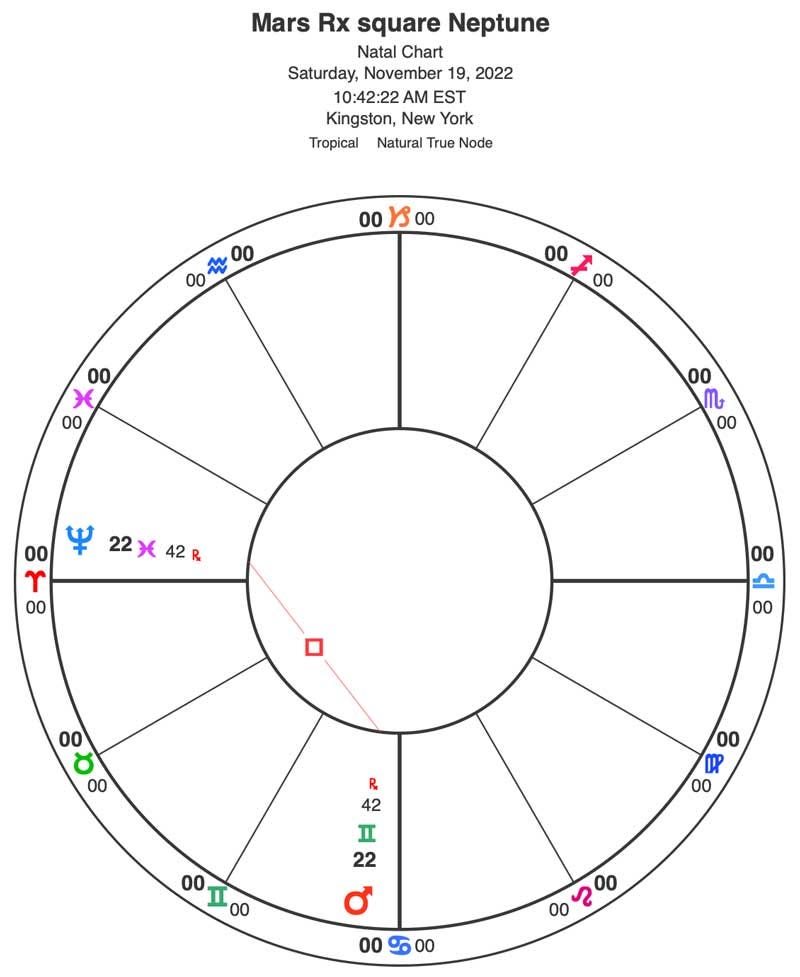 Mars is square Neptune for a few days about once a year. That is a 90-degree meeting of two planets that make a really weird synthesis when they get together.