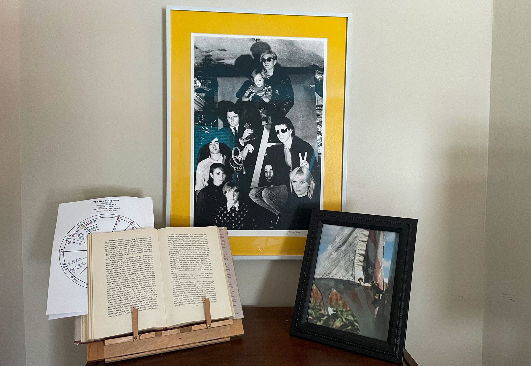 Billy gave me a gelatin print of his photo of Andy Lou VU Nico at The Factory…which I framed in banana yellow…the book is Ulysses by Joyce…in the Planet Waves studio…photo at top.