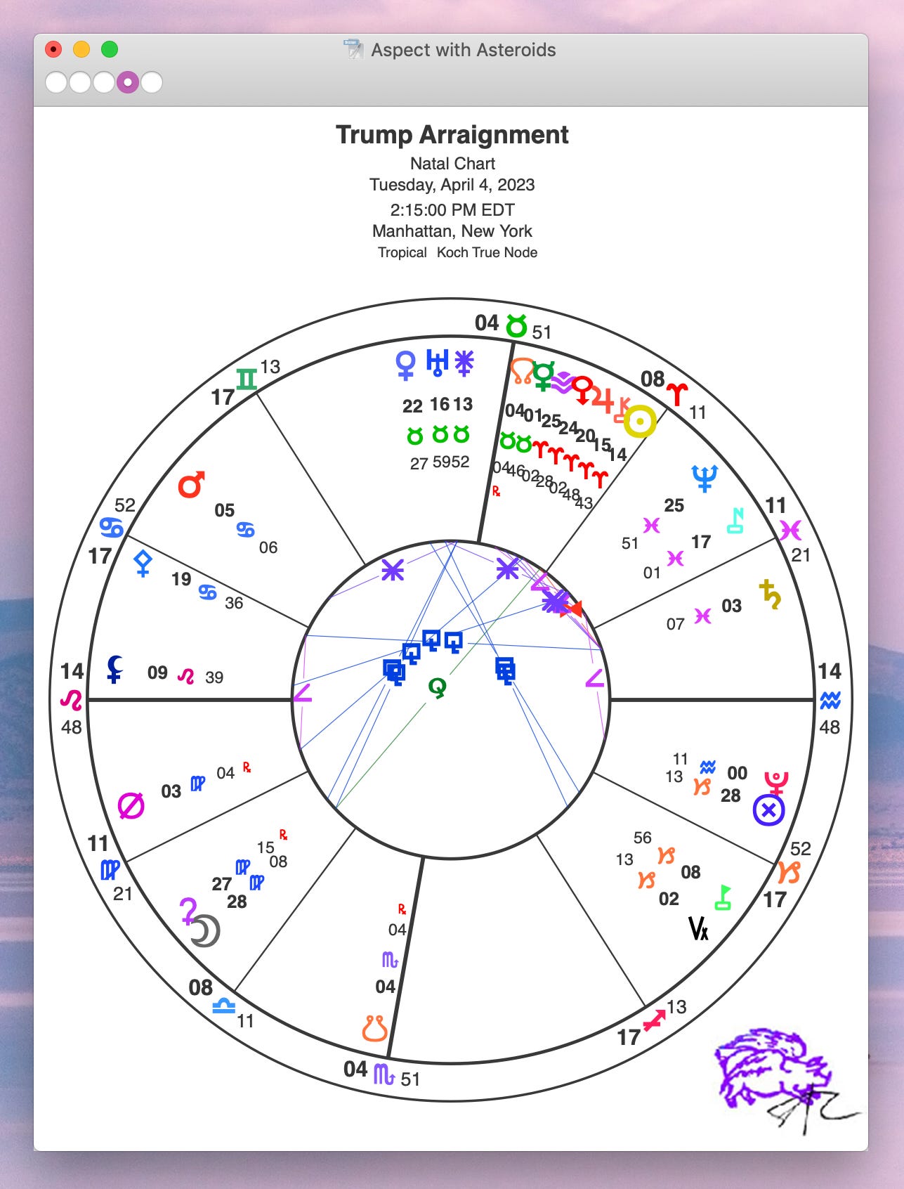 Note, this past Friday’s edition of STARCAST (distributed only via Planet Waves, not Substack) covered the release of the indictment. Today I am adding the chart for the arraignment. Tap the link for the program and the chart.
