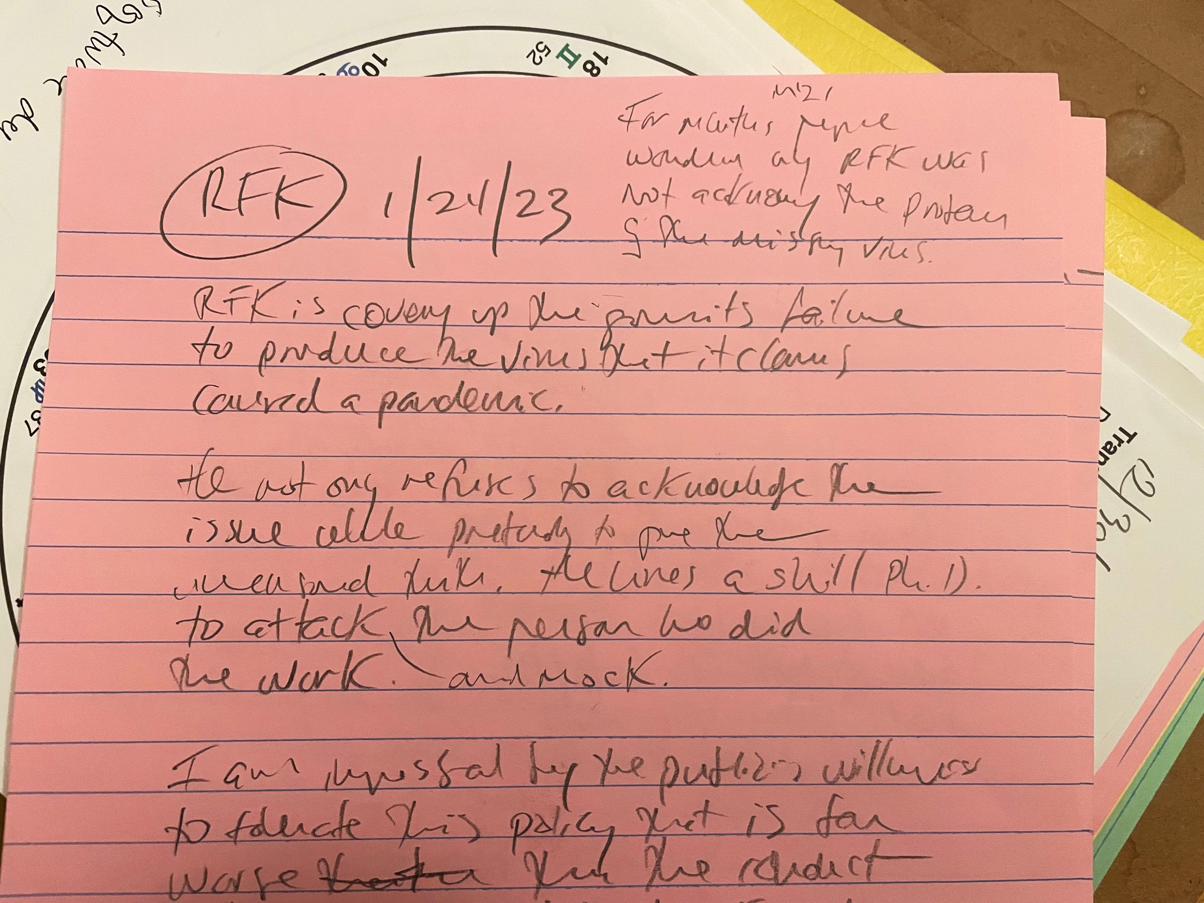 Many outspoken figures take a public position and a private position on the same issue. Publicly, Mr. Kennedy says he thinks there is a virus, and that the government’s confirmation that there is not one doesn’t tell us much. Privately, Mr. Kennedy gave a very different answer than his roundabout response when I asked him about the virus FOIs last April.